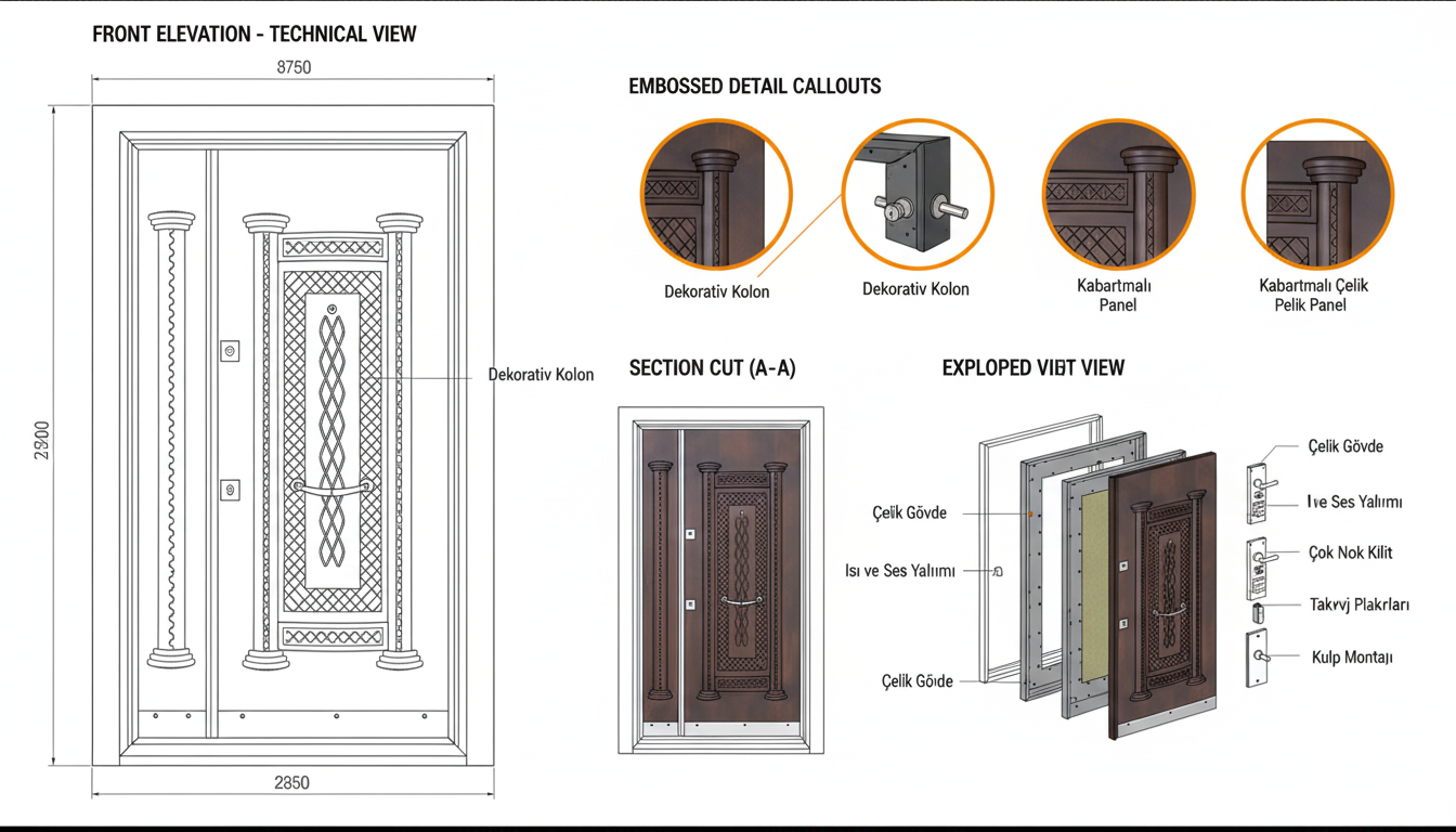 Lüks kabartmalı çelik seri kapılar, estetik detayları güçlü mühendislik yapısıyla bir araya getirir. Özenle tasarlanan kabartmalı yüzeyler ve sağlam çelik iskelet, kapıya hem görsel bir ihtişam hem de yüksek dayanıklılık kazandırır.