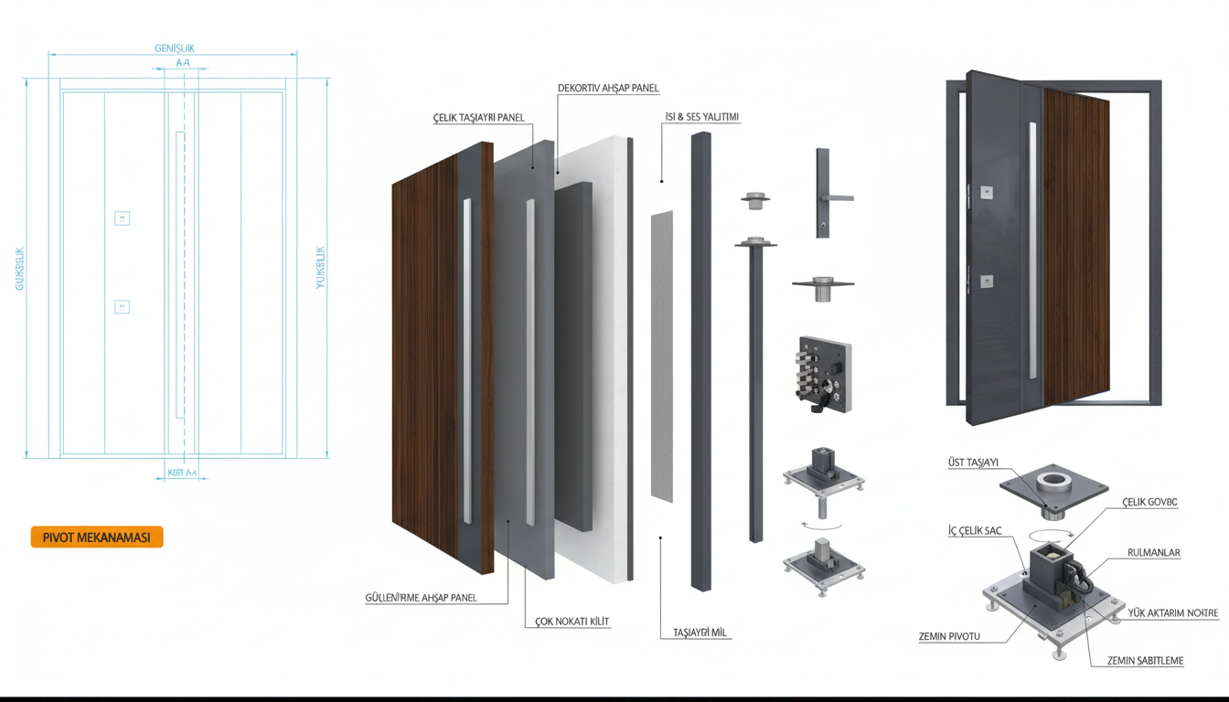 Pivot kapı sistemi, üst ve alt pivot mekanizması sayesinde kapının dengeli ve akıcı bir şekilde açılmasını sağlar.